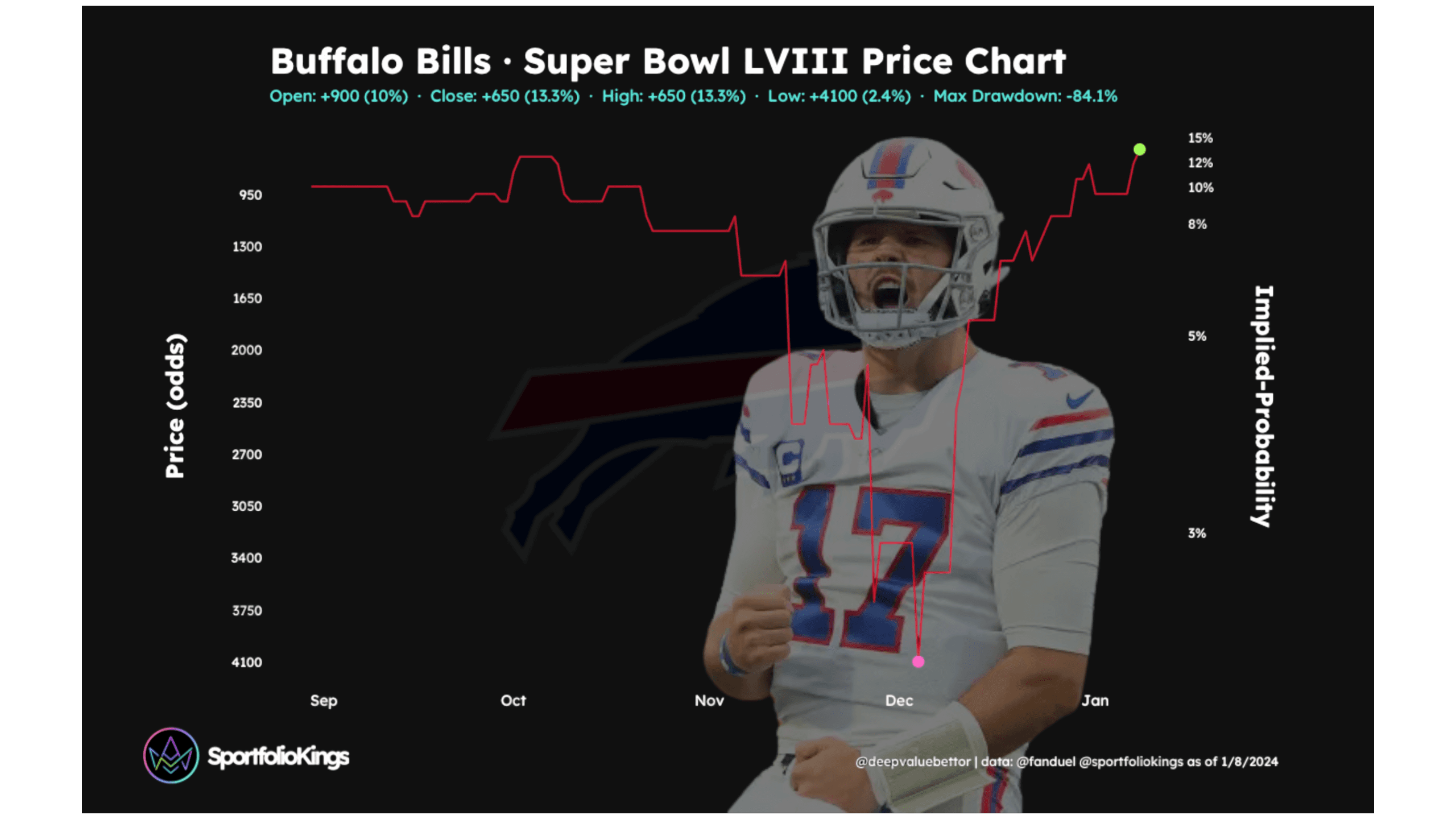 The Bills limped into their late season bye week and their Super Bowl futures prices sunk to as low as +4100 on December 4th (implying a 2.4% chance).