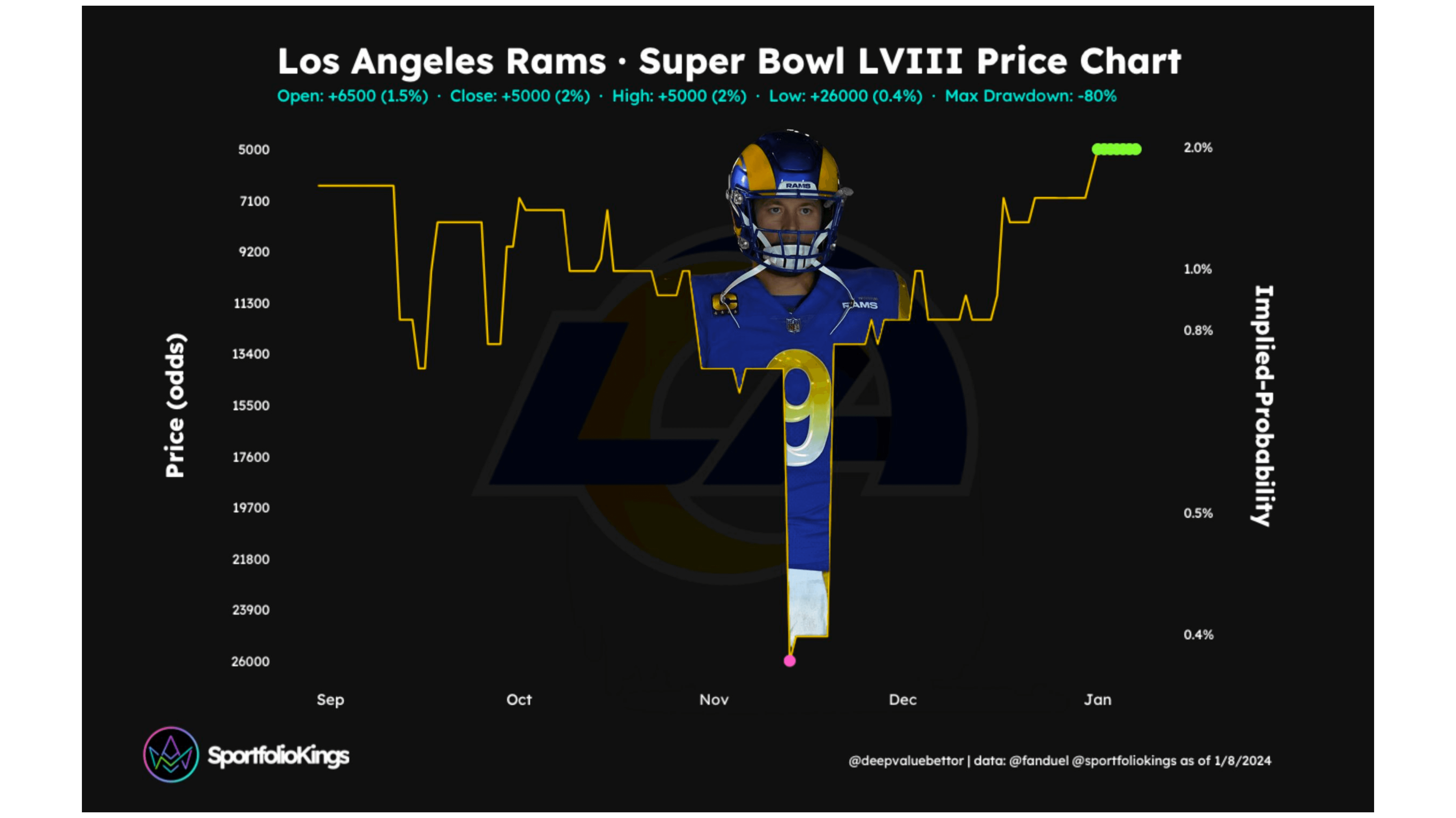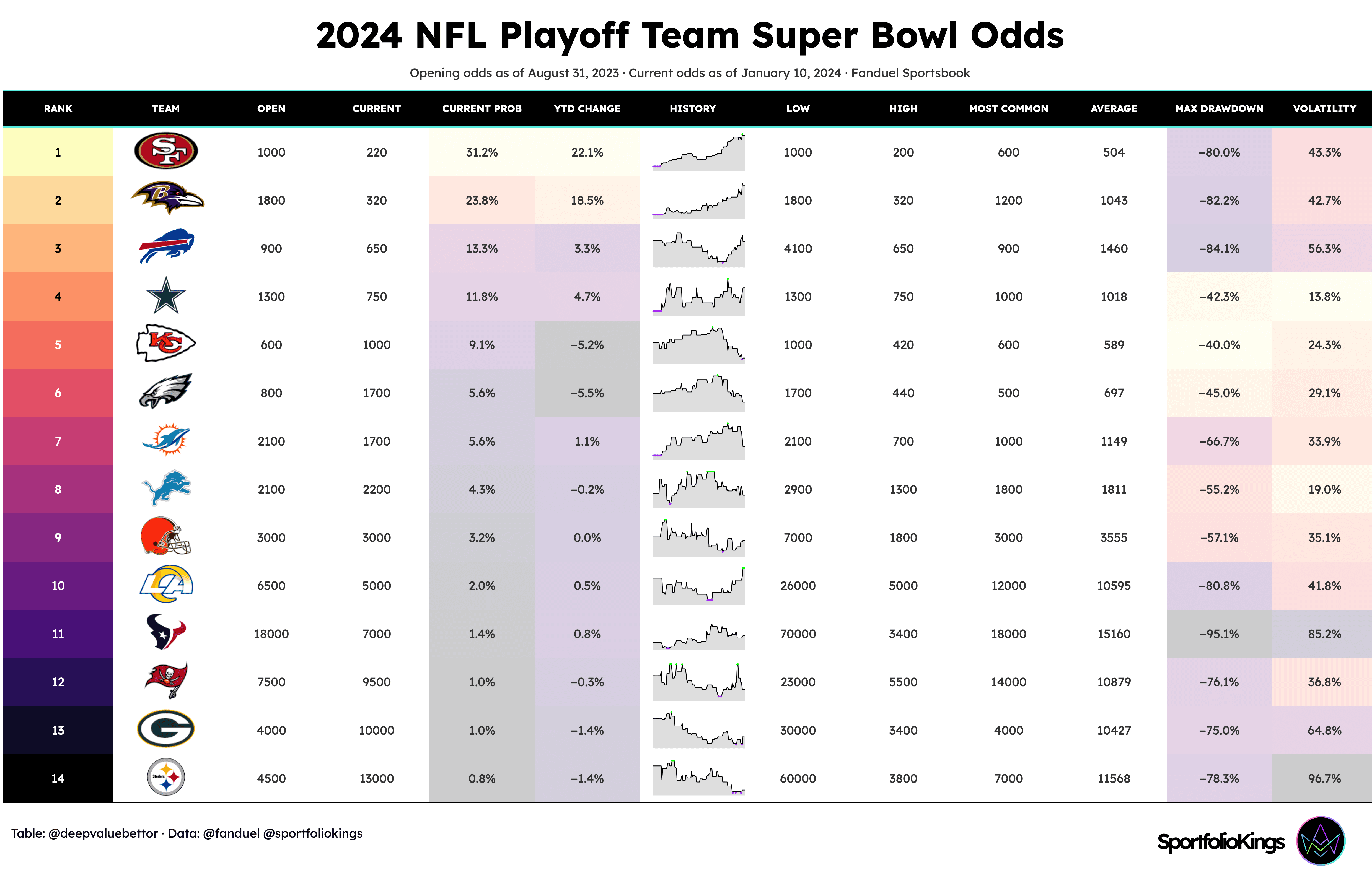 Neither team experienced too much volatility in expectations over the 2023 season. The 49ers hit a October speedbump and lost 3 straight games - but bettors didn't reactly too harshly - as prices never drifted lower than +600.