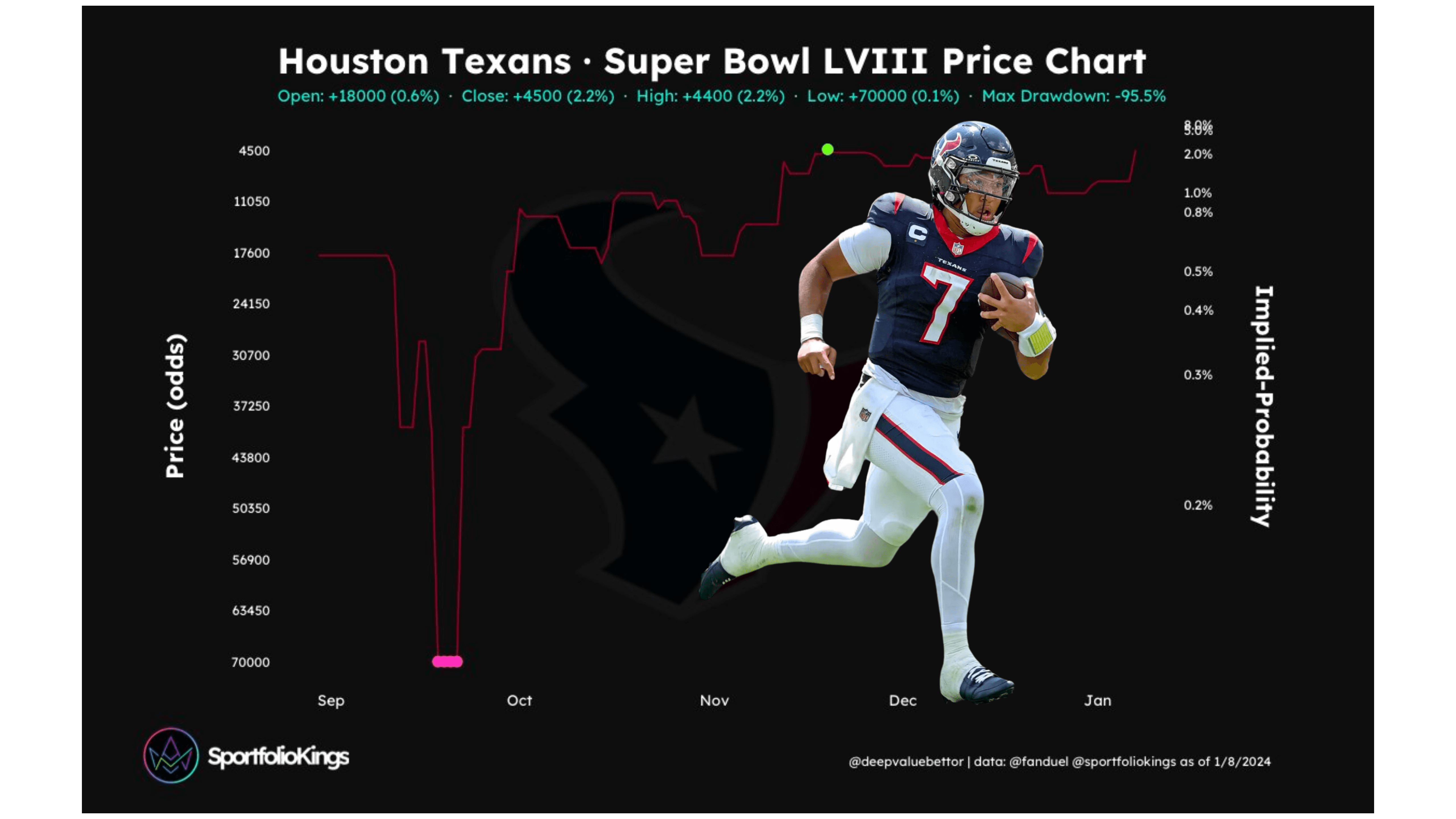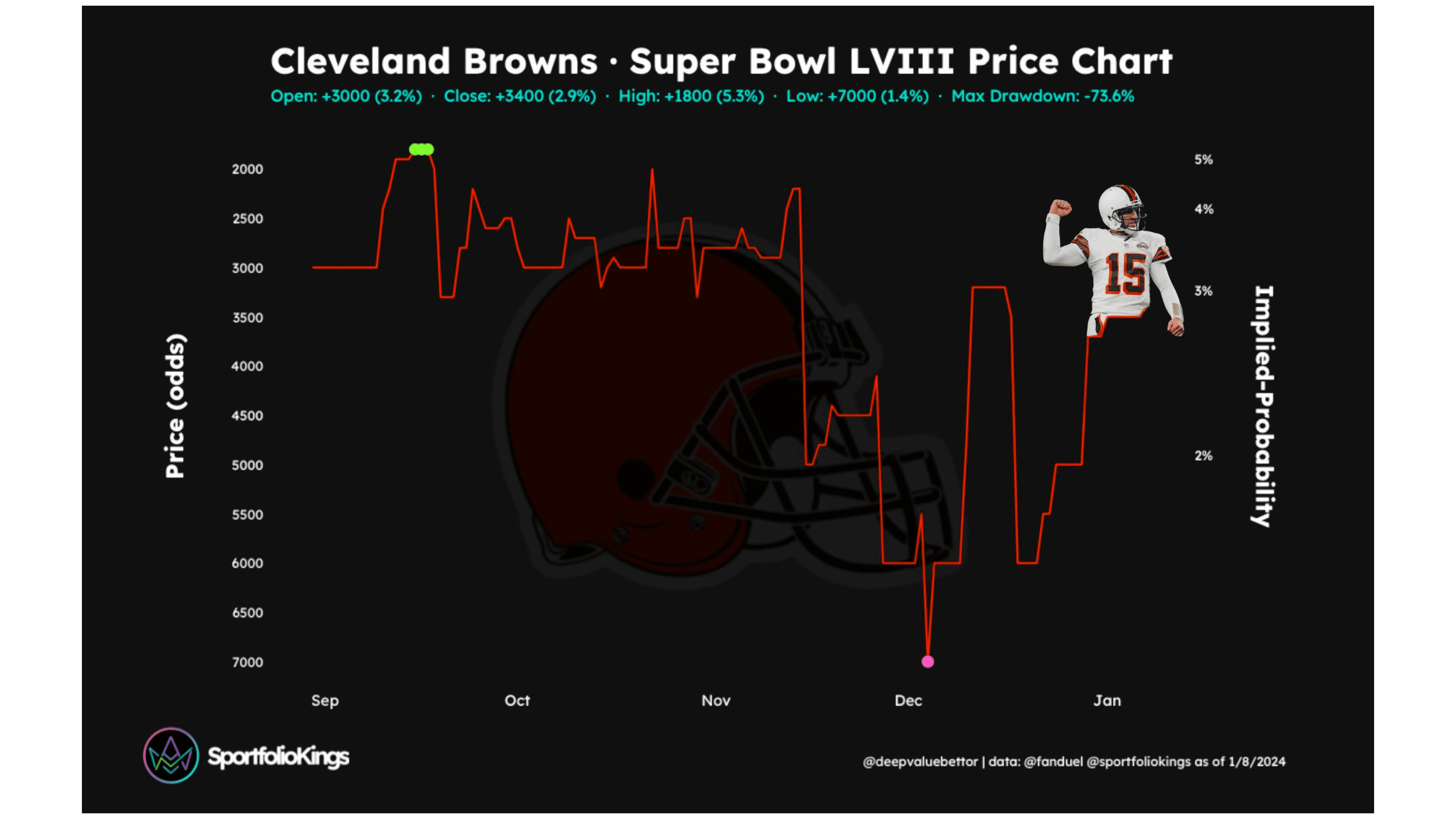 The Browns closed the regular season at +3400 (2.9%) - but as playoff matchups crystalized, bettors quickly bid the Browns up to +3000. This is the same price the Browns came into the season with, which of course priced-in a fully healthy Deshaun Watson.