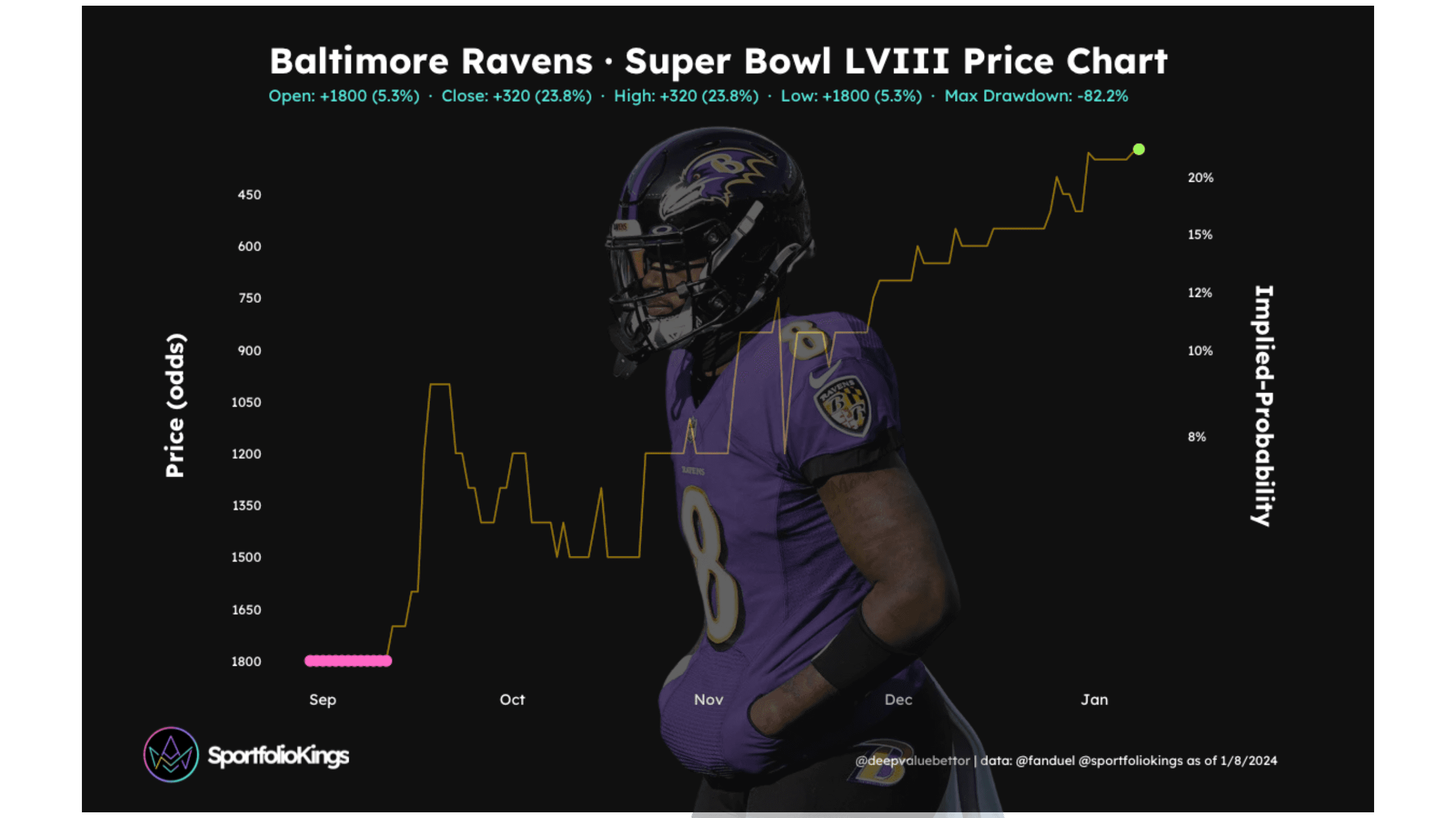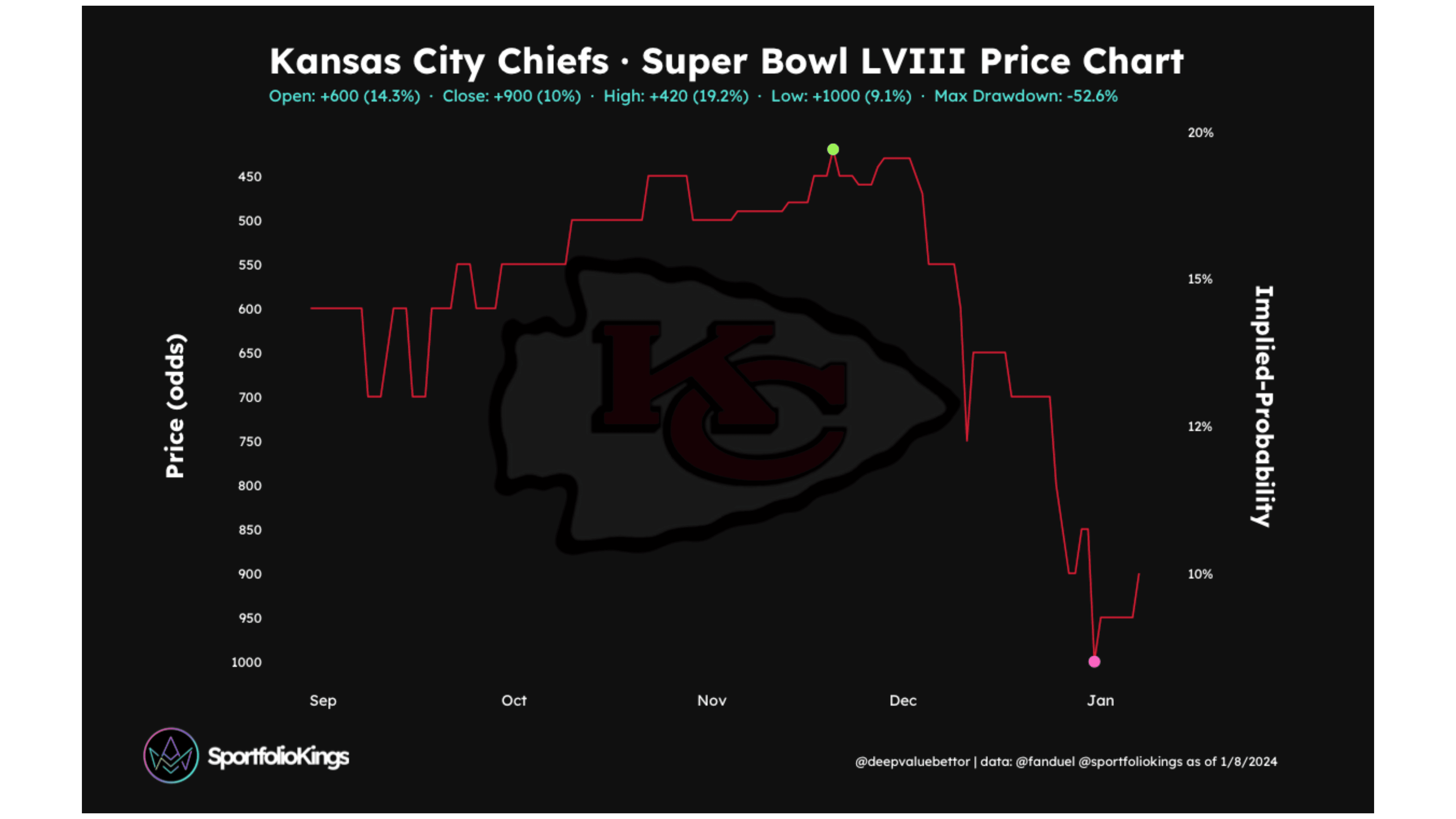 But after 3 months of offensive ineptitude, even the most ardent Mahomes stans began to lose confidence. Chiefs' prices have been in freefall the last 4 weeks - down 52% from their late November high - bottoming at +1000 last week.