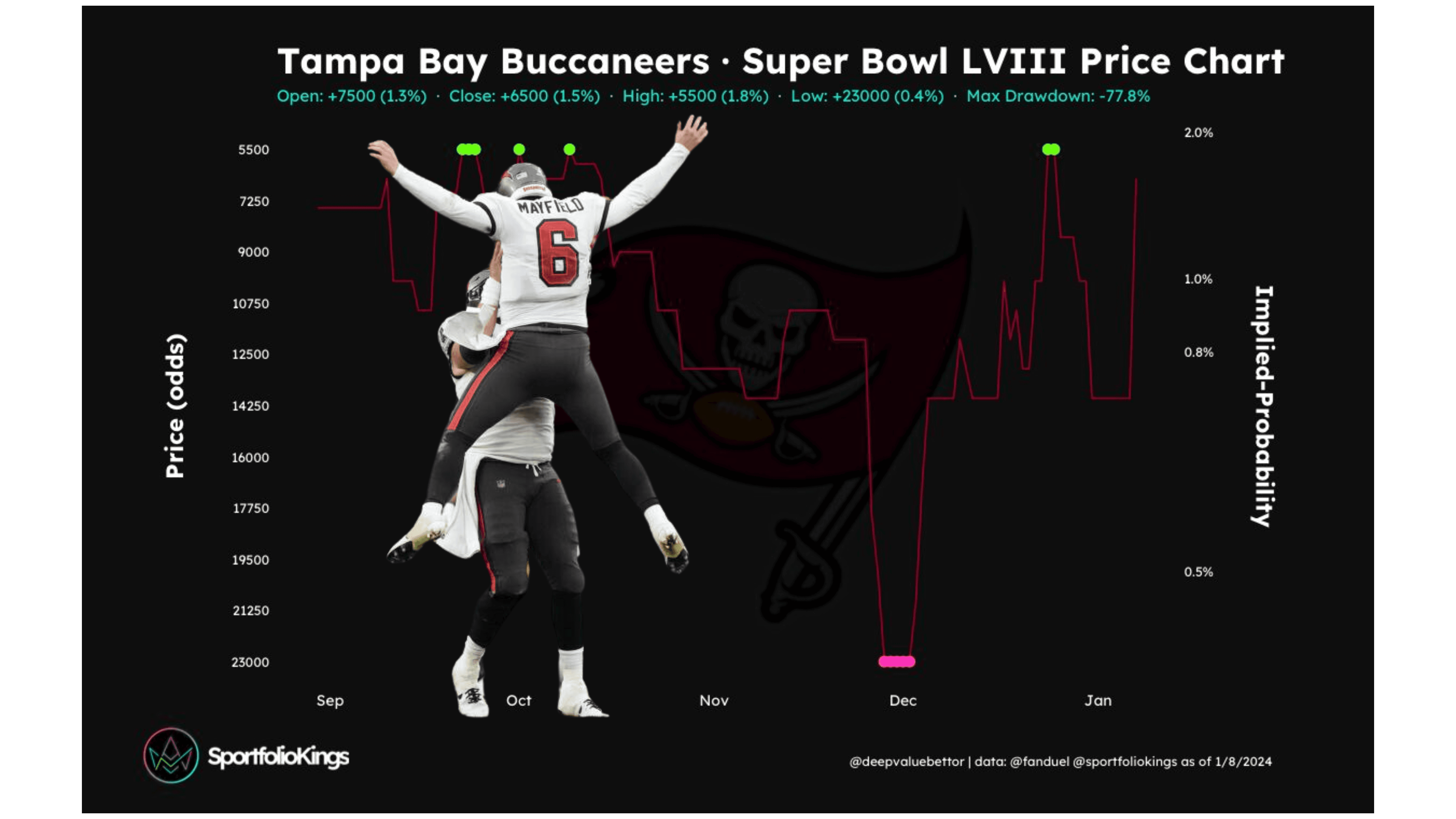 They opened the season at 75/1 (1.3%) and hovered in that range thru early October, when prices started to deteriorate. The Bucs lost 7 of 9 games midseason and prices bottom at 230/1 in early December after a 78% selloff.
