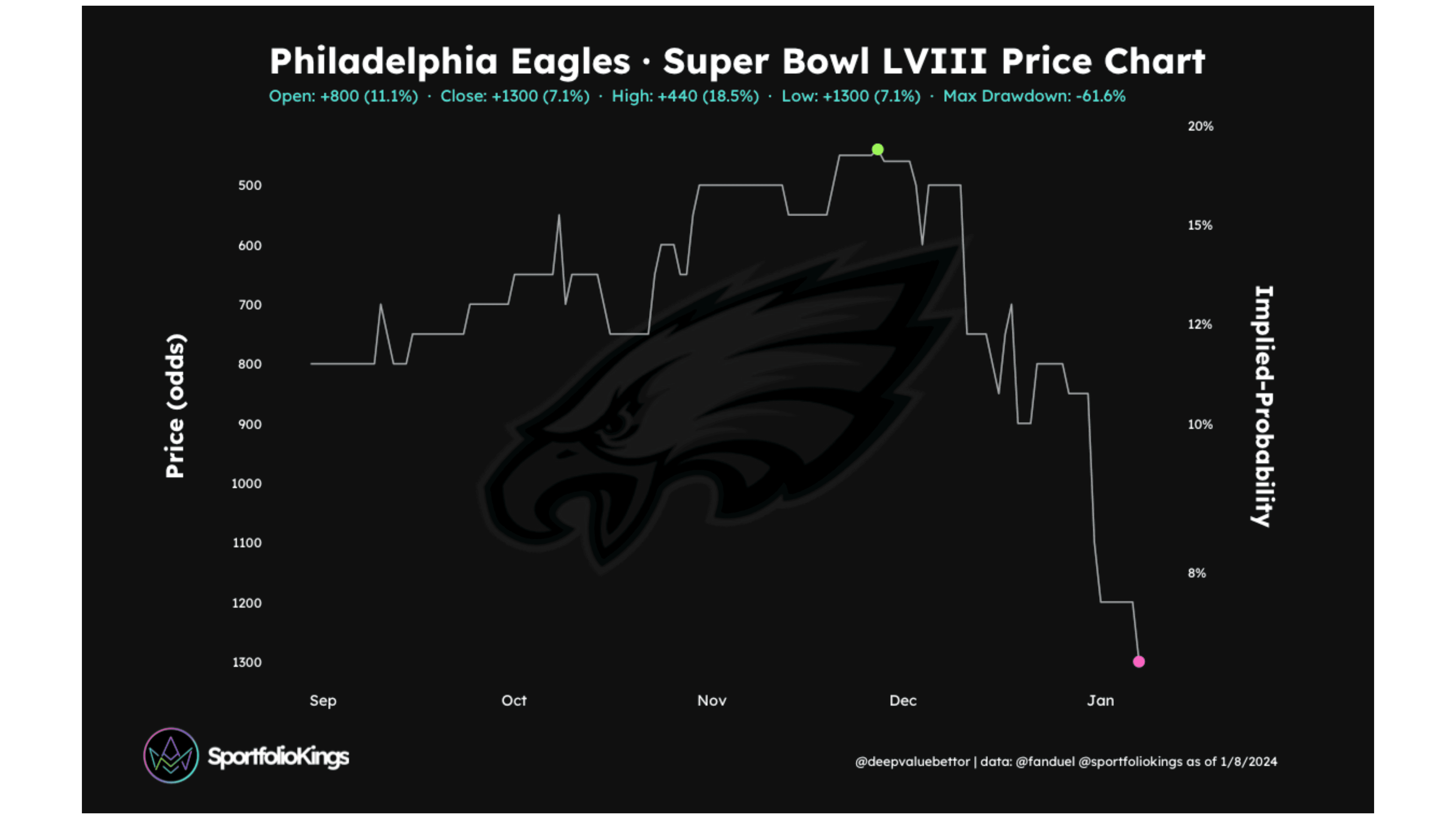The Kansas CIty Chiefs and Philadelphia Eagles - last year's Super Bowl matchup and the two top teams coming into 2023 - closed the regular season season in disarray after nightmarish Decembers and are the only 2024 playoff teams whose Super Bowl odds are priced at their season-lows.