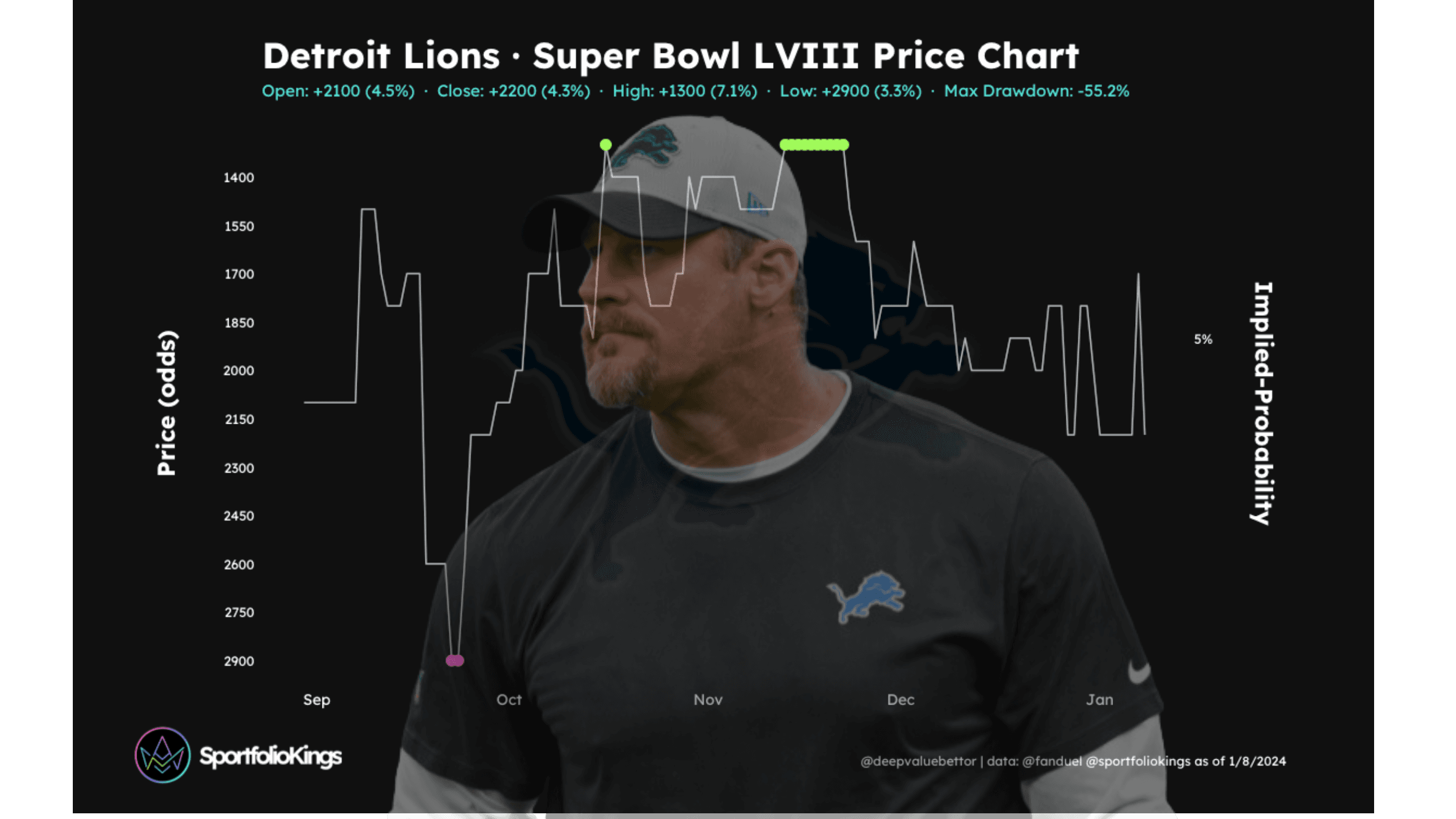 They opened the season with the 26th worst odds at 65/1. Midseason turmoil and uncertainty around Matthew Stafford's health depressed prices, causing odds to fall 80% from the season opener to 260/1. The bottom was short-lived however, and proceeded to rocket to new highs over the next 8 weeks.