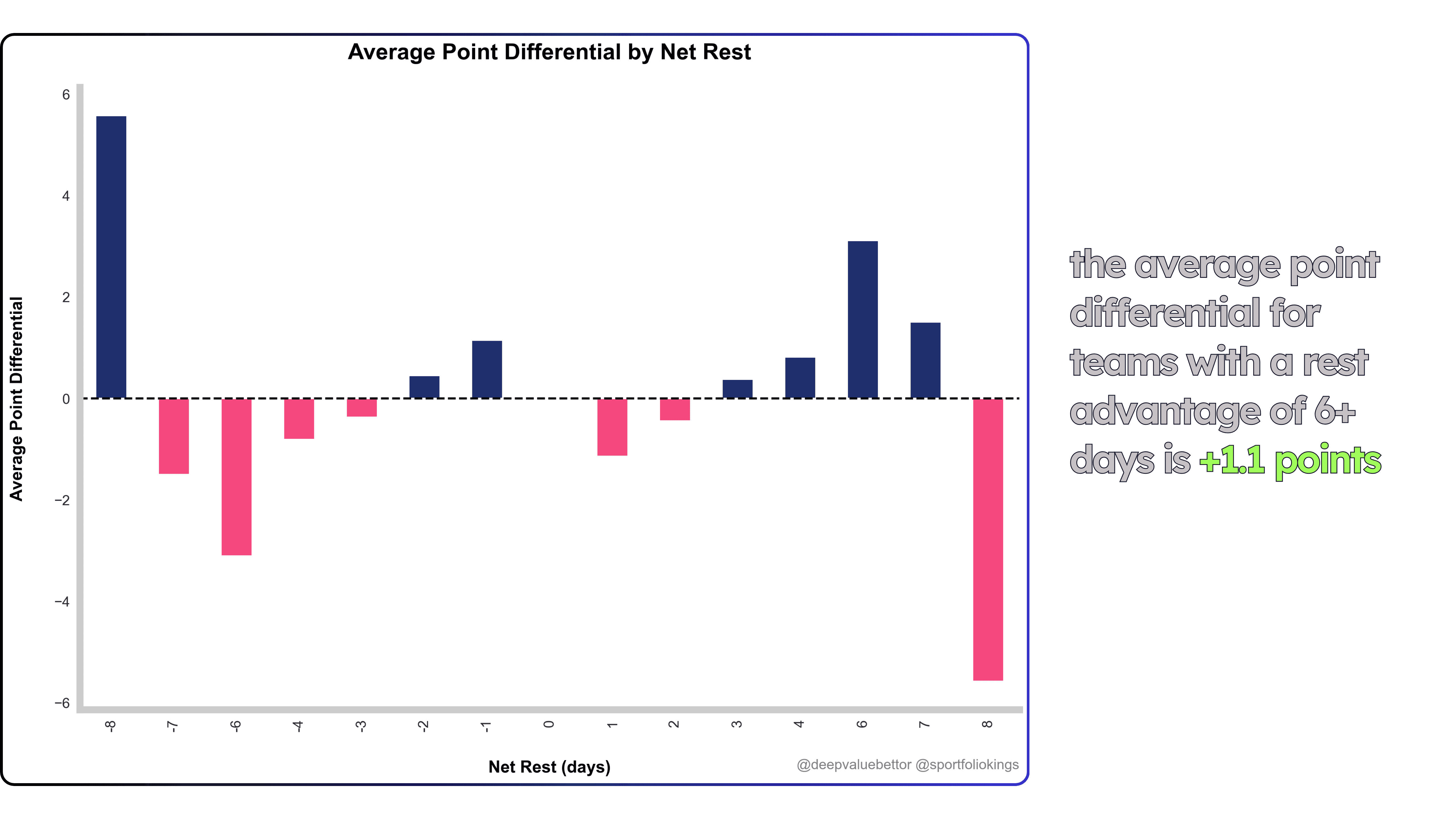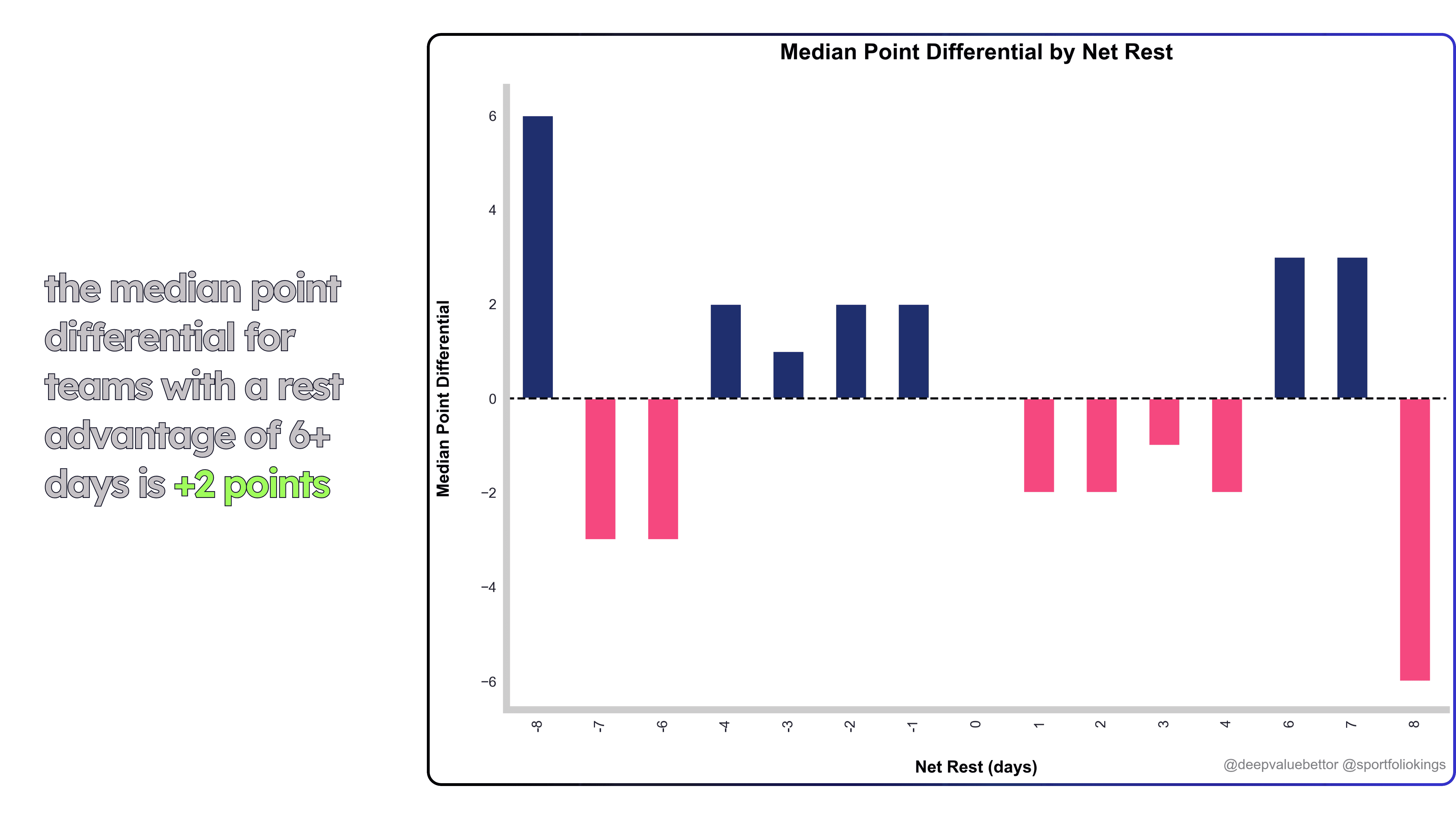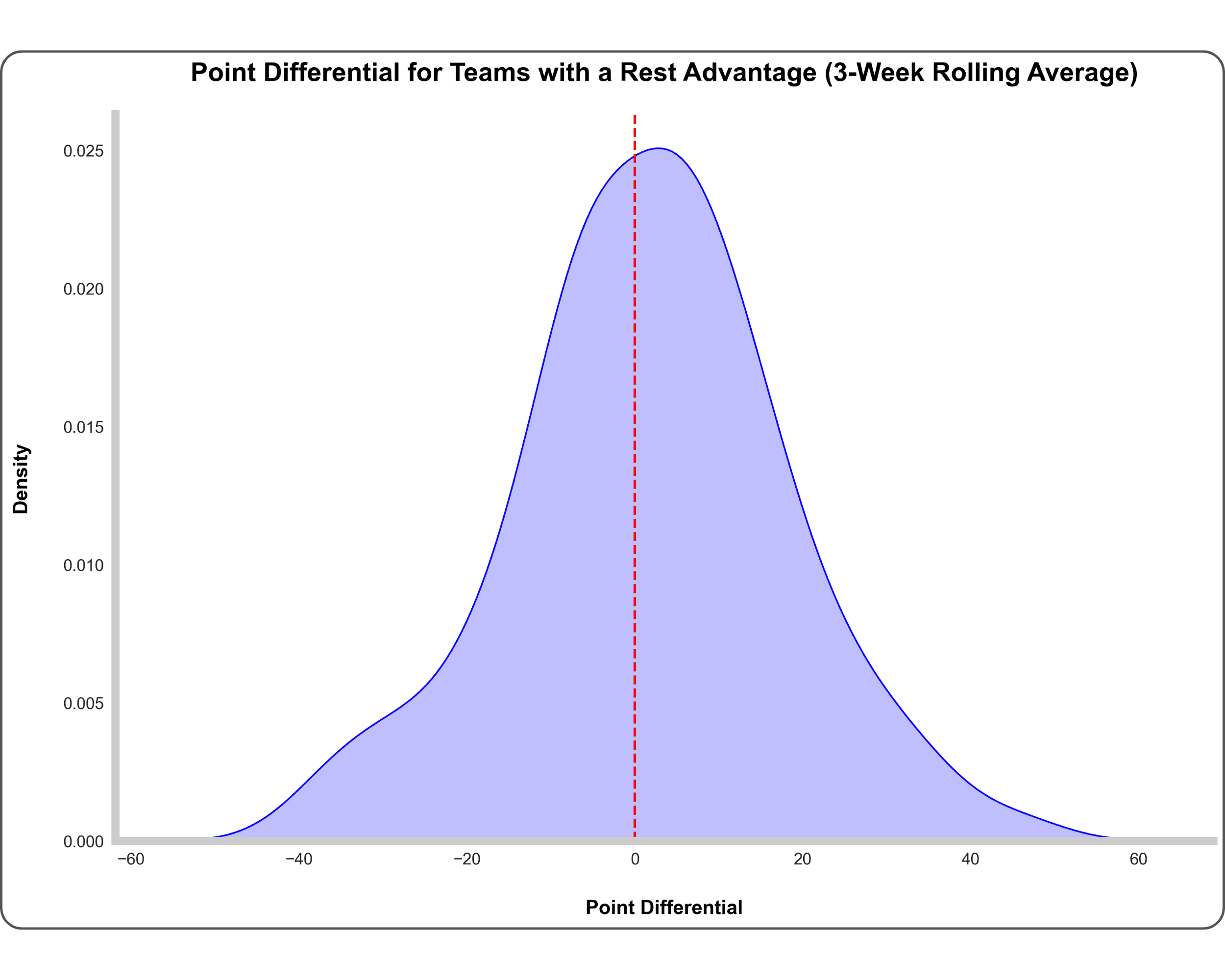 Teams with a rolling 3-week average of more than 3 excess net rest days (and the opponent had a rolling average of less than -3 days net rest) had an average point differential of +1.82 and a median of +3 over a sample of 186 games.