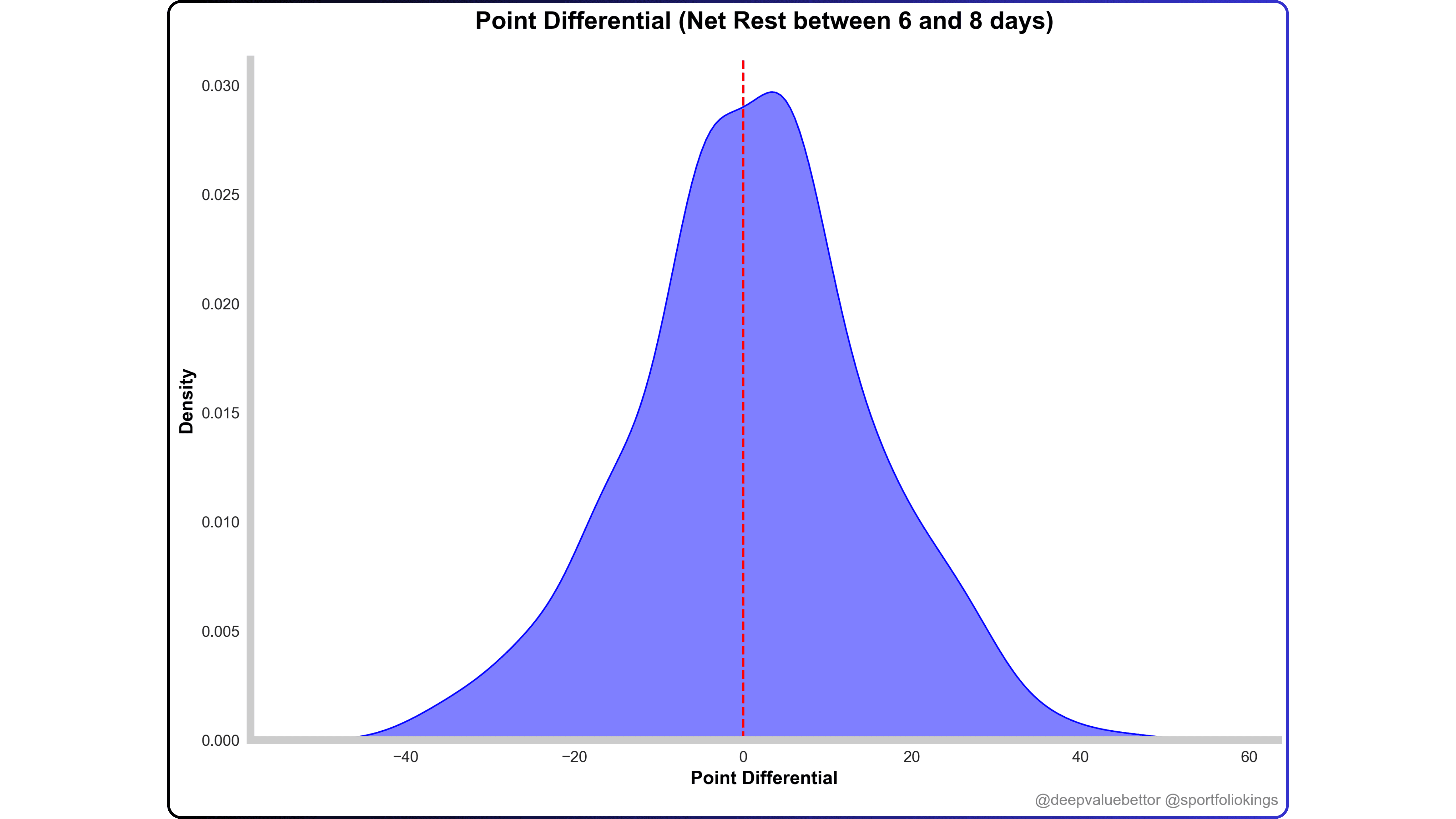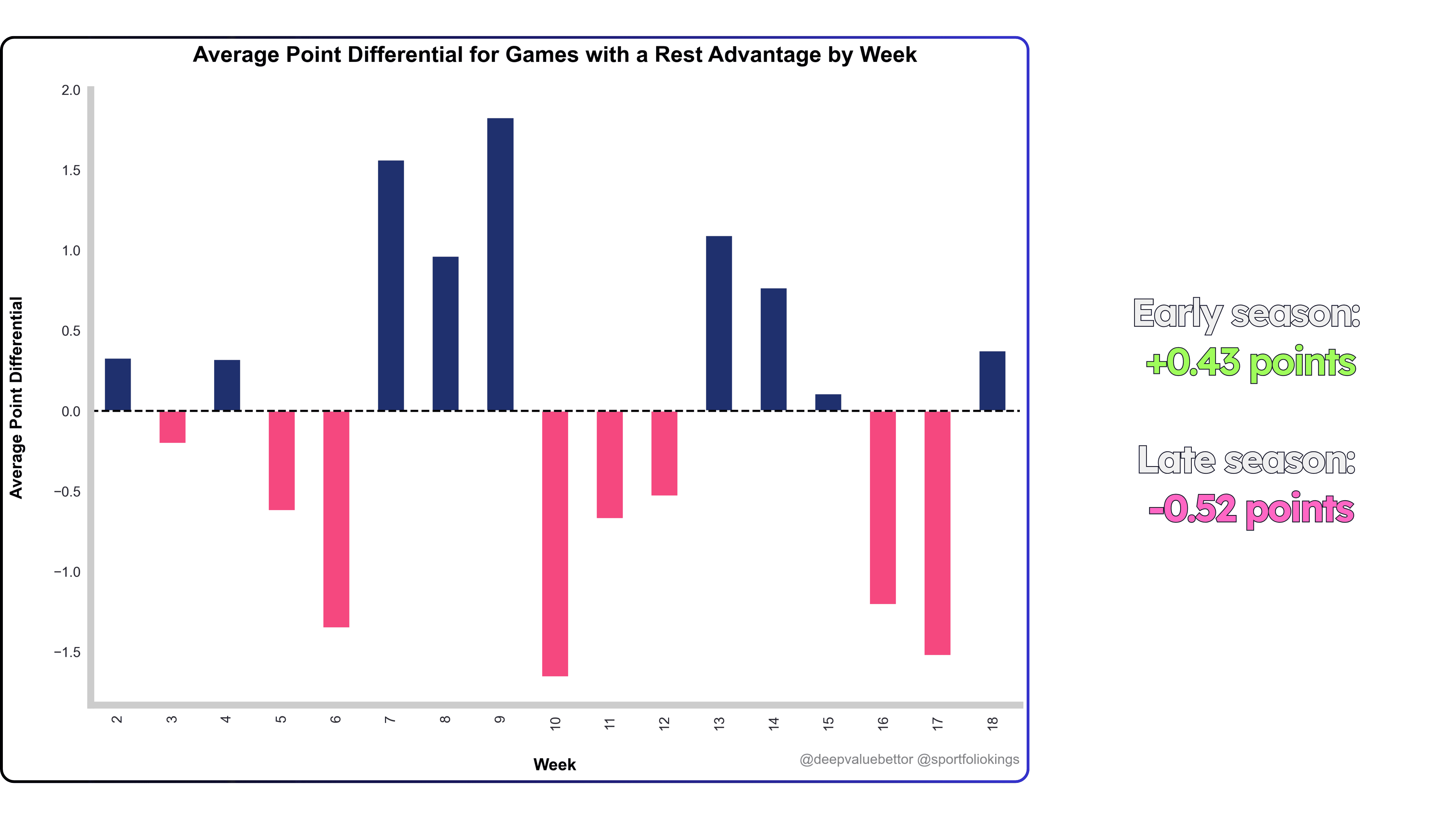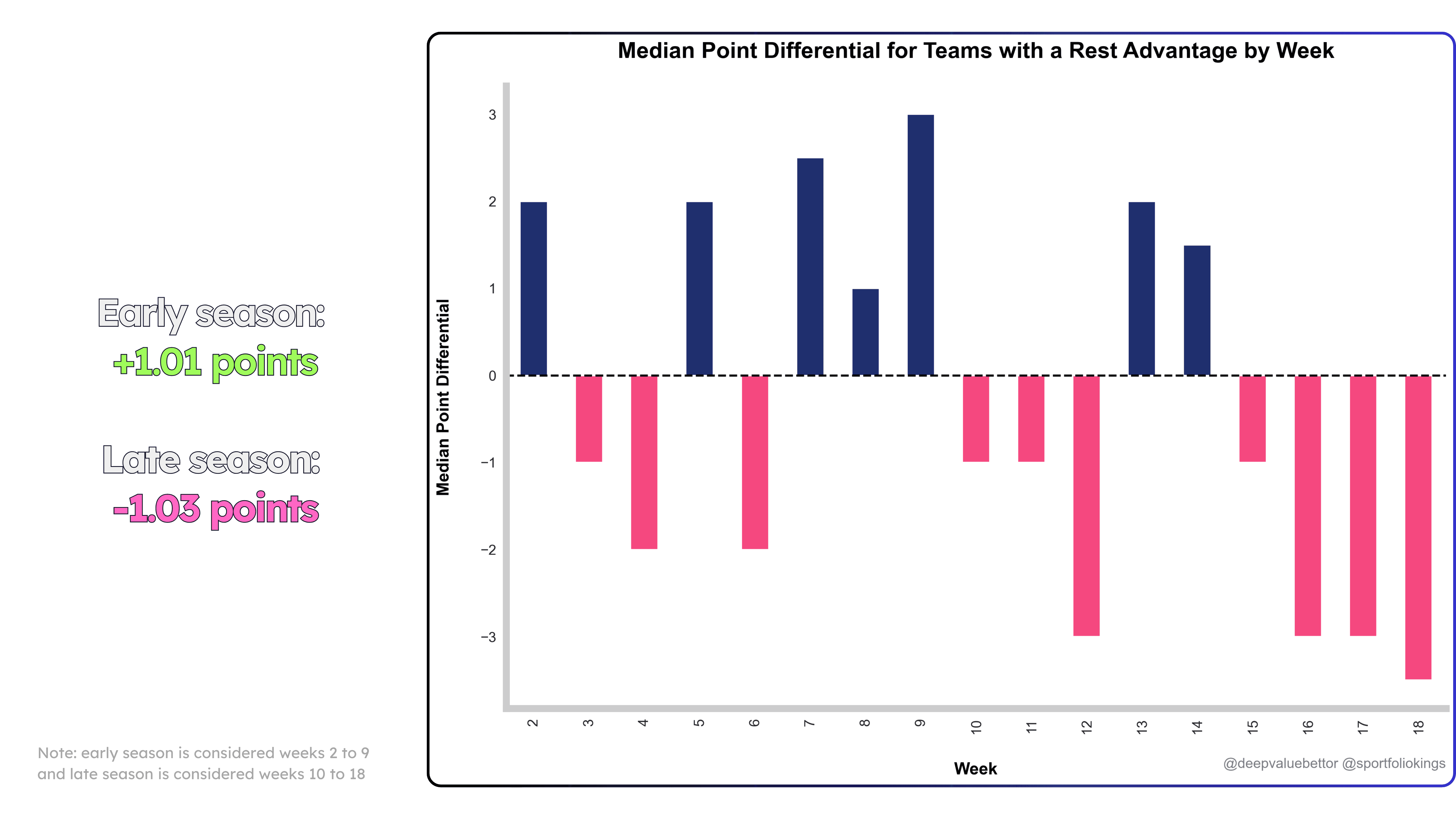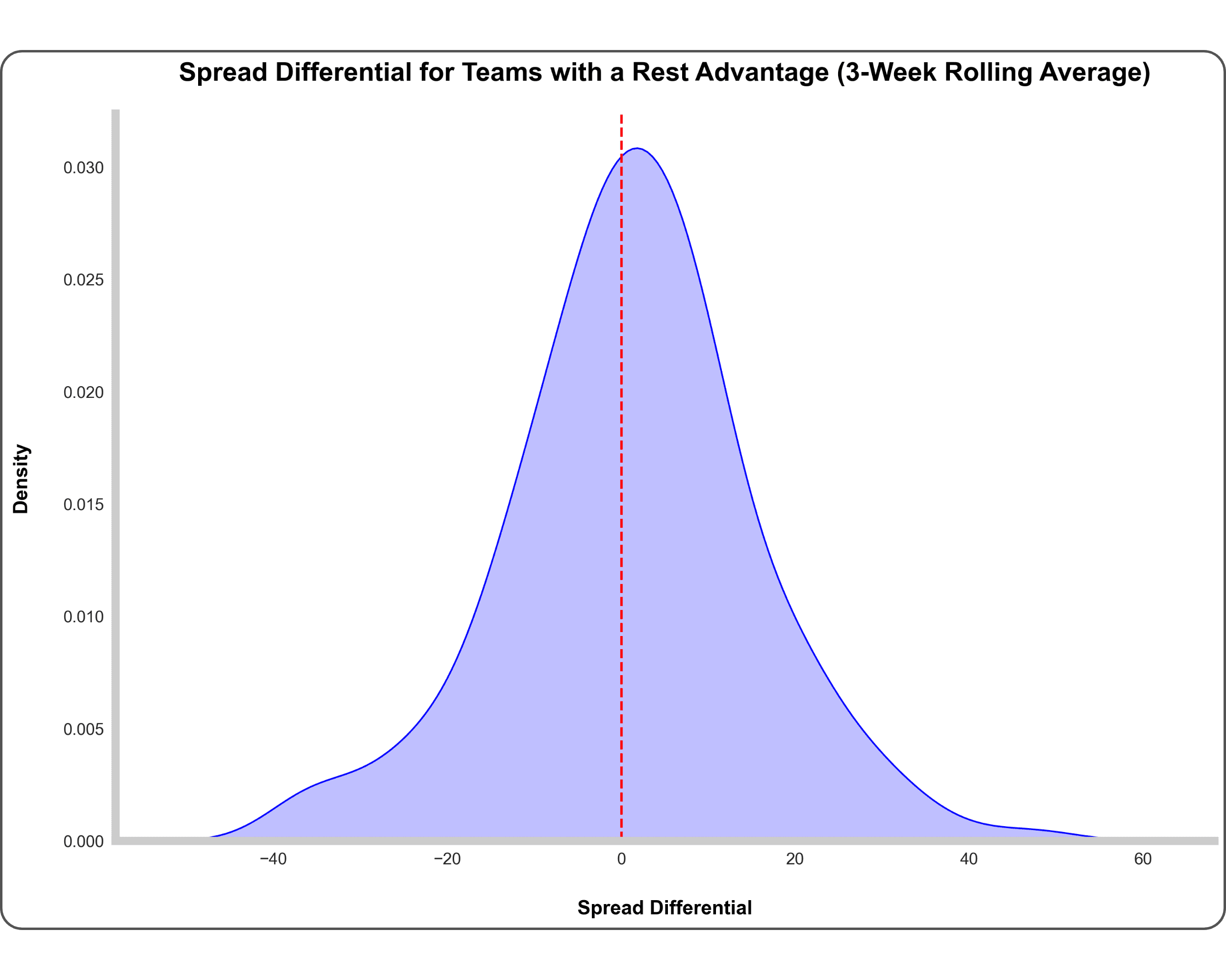 Teams with a rolling 3-week average of more than 3 excess net rest days (and the opponent had a rolling average of less than -3 days net rest) had an average point differential of +1.82 and a median of +3 over a sample of 186 games.