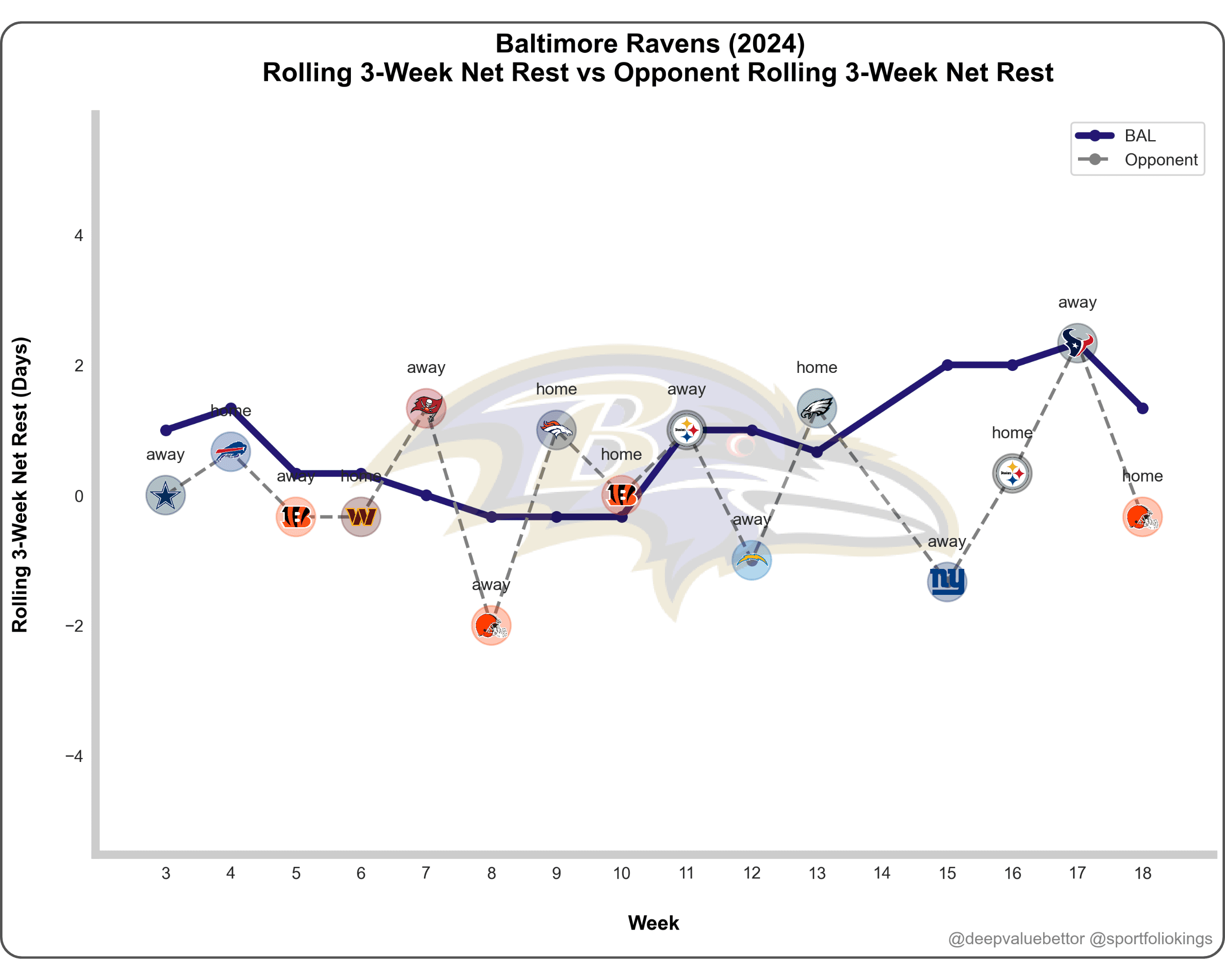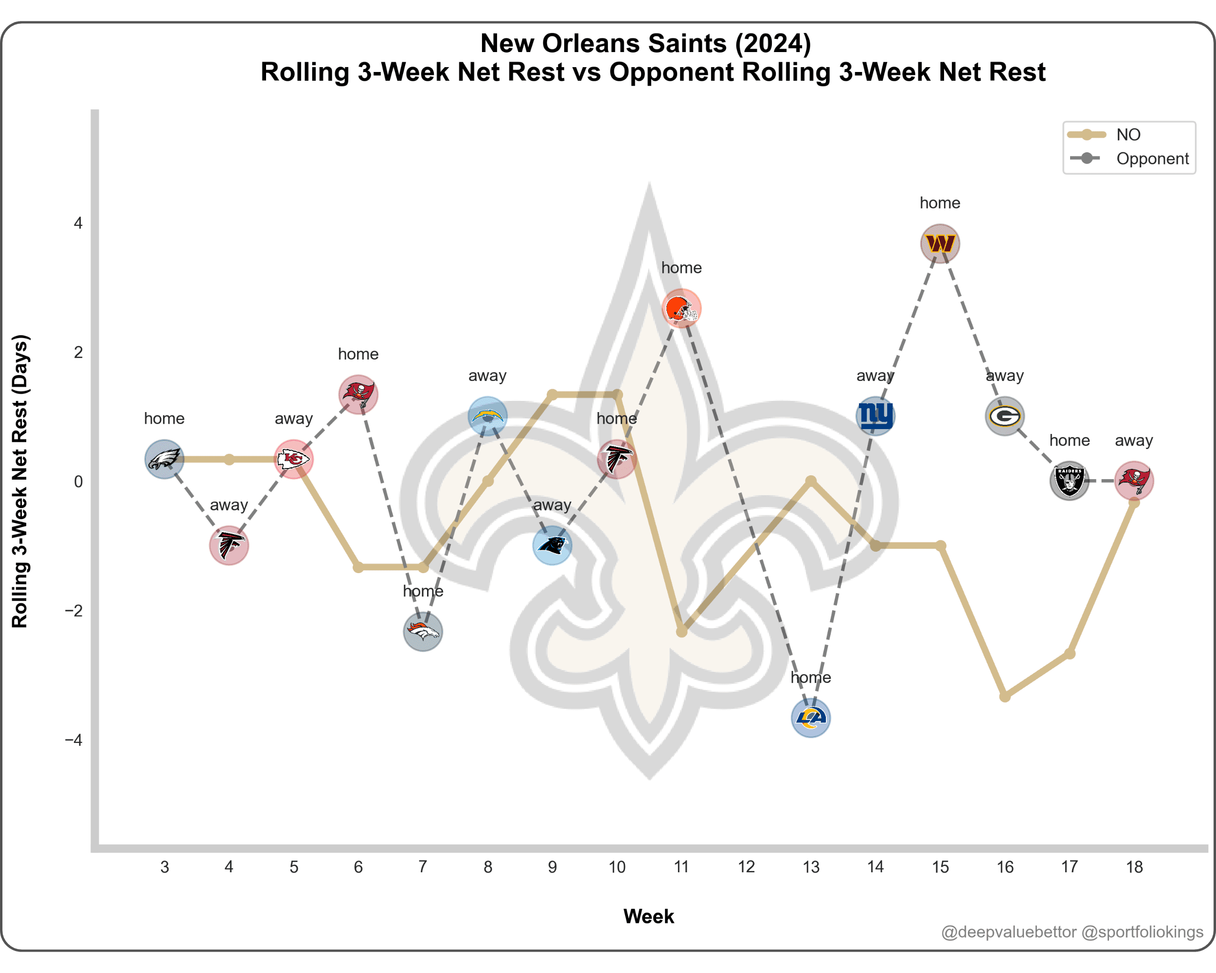 In practice, this means we need a defined surplus of relative net rest days to trigger a reliable advantage, but perhaps most importantly, the opponent must have at least some deficit of net rest days to trigger a reliable disadvantage. For example, a rolling 3-week net-net rest advantage of 3 days in the form of a rolling 3-week net rest of +4 days and an opponent's rolling 3-week net rest of +1 day would not yield as considerable an advantage as a rolling 3-week net rest of 0 days and an opponent's rolling 3-week net rest of -3 days.
