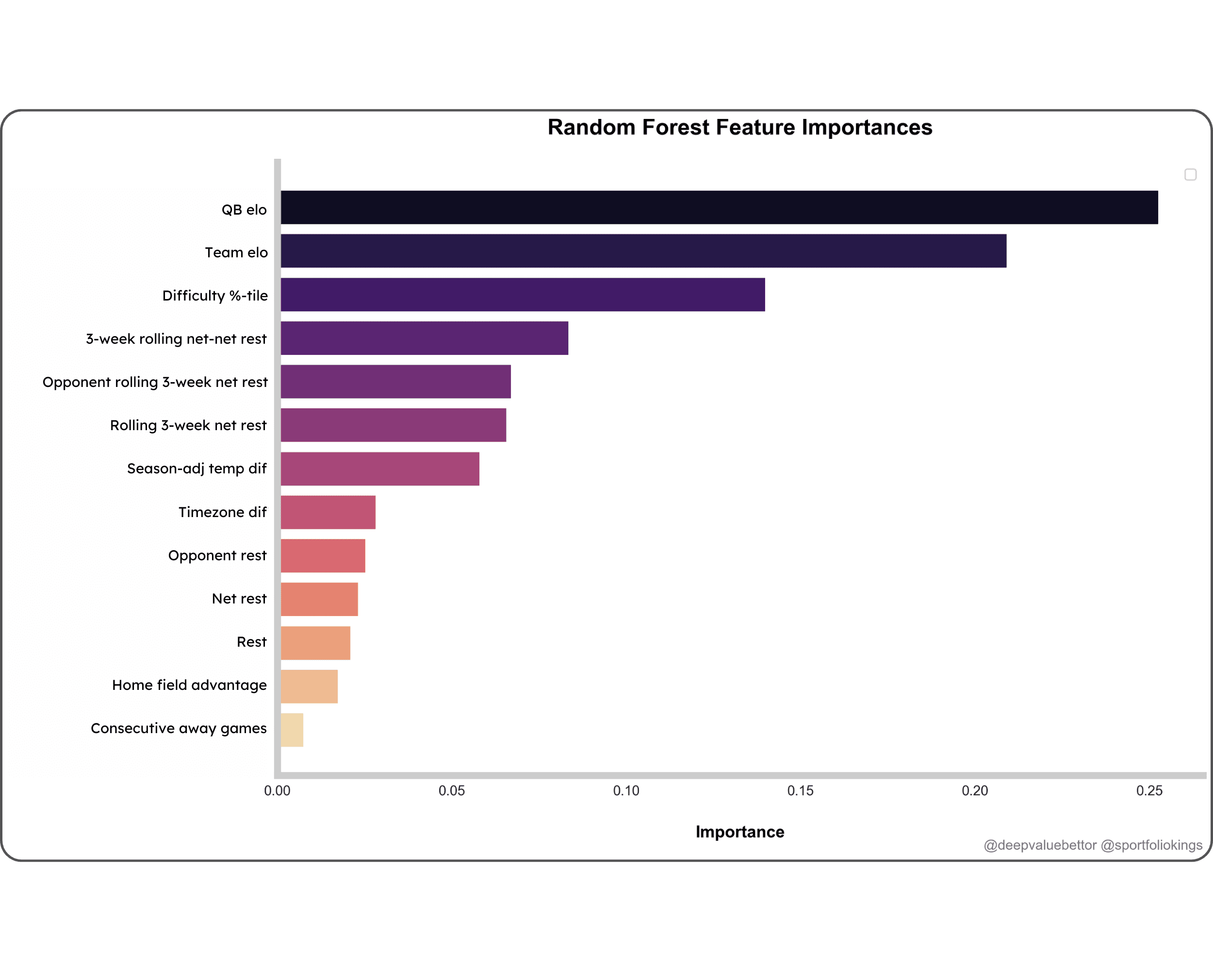 To help disentangle the effects of rest from other variables, we leveraged more sophisticated multivariate techniques using Random Forest and XGBoost machine learning models. For this analysis, we trained on data from 2000 to 2018 and tested on data from 2019 to 2023. Some examples of meaningful contextual variables we included were, among others, time zone differences, elevation differences, seasonally-adjusted local temperature differences, miles traveled, consecutive road games, and a custom modeled situational difficulty percentile feature.