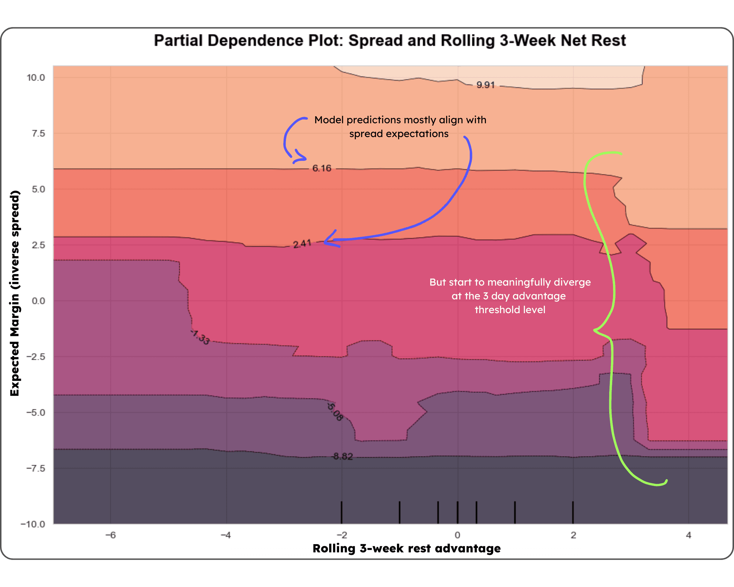 To do so, we tested various excess net rest thresholds (for example, a 3-week rolling average of +/- 4 net rest days relative to their opponent). We used various machine learning techniques to attempt to disaggregate the impact of our rolling rest metrics among other variables and isolate the relative importance of each feature in a multivariate context. We also also wanted to ensure the thresholds were sensible and not overly precise or otherwise overfit to the data.