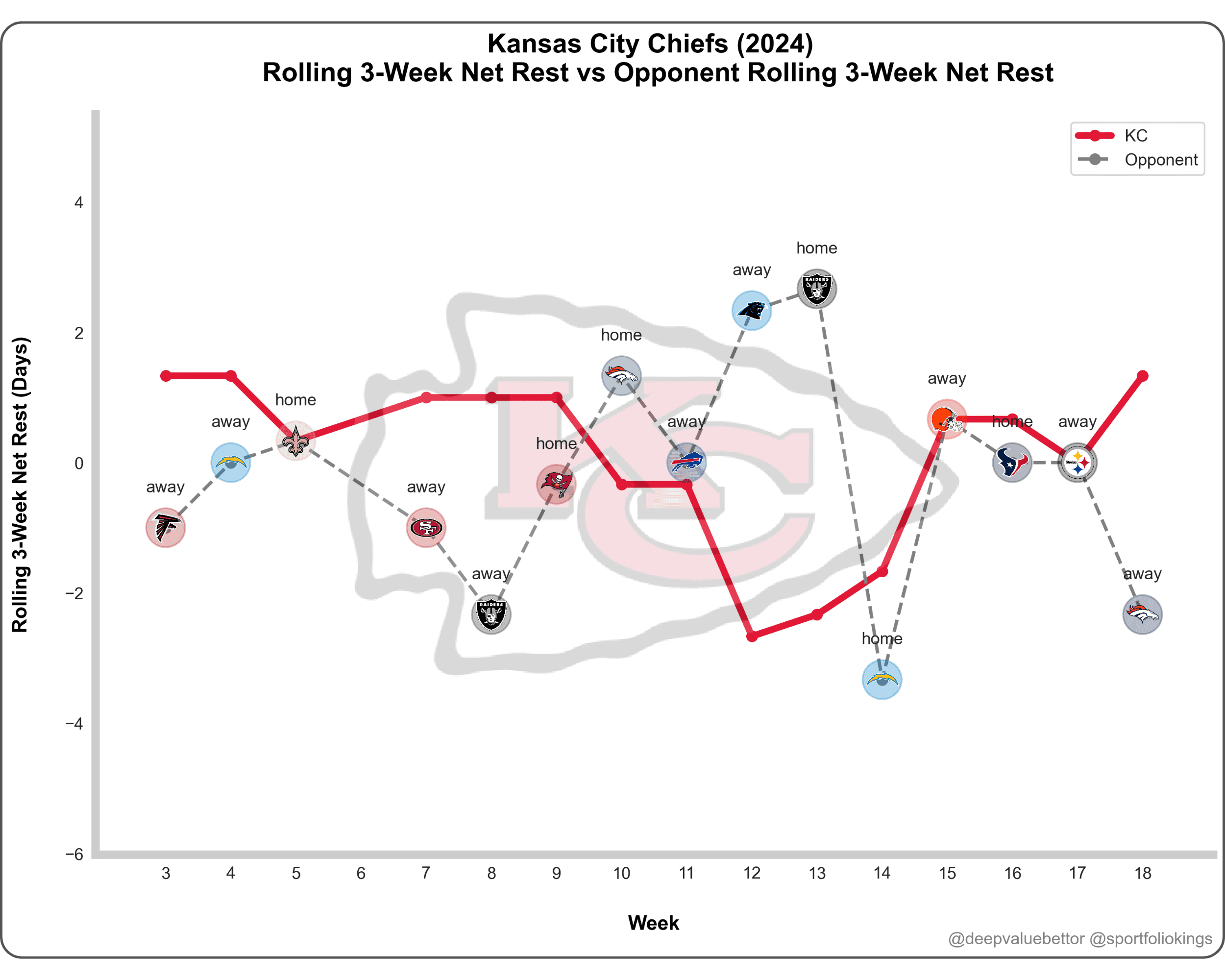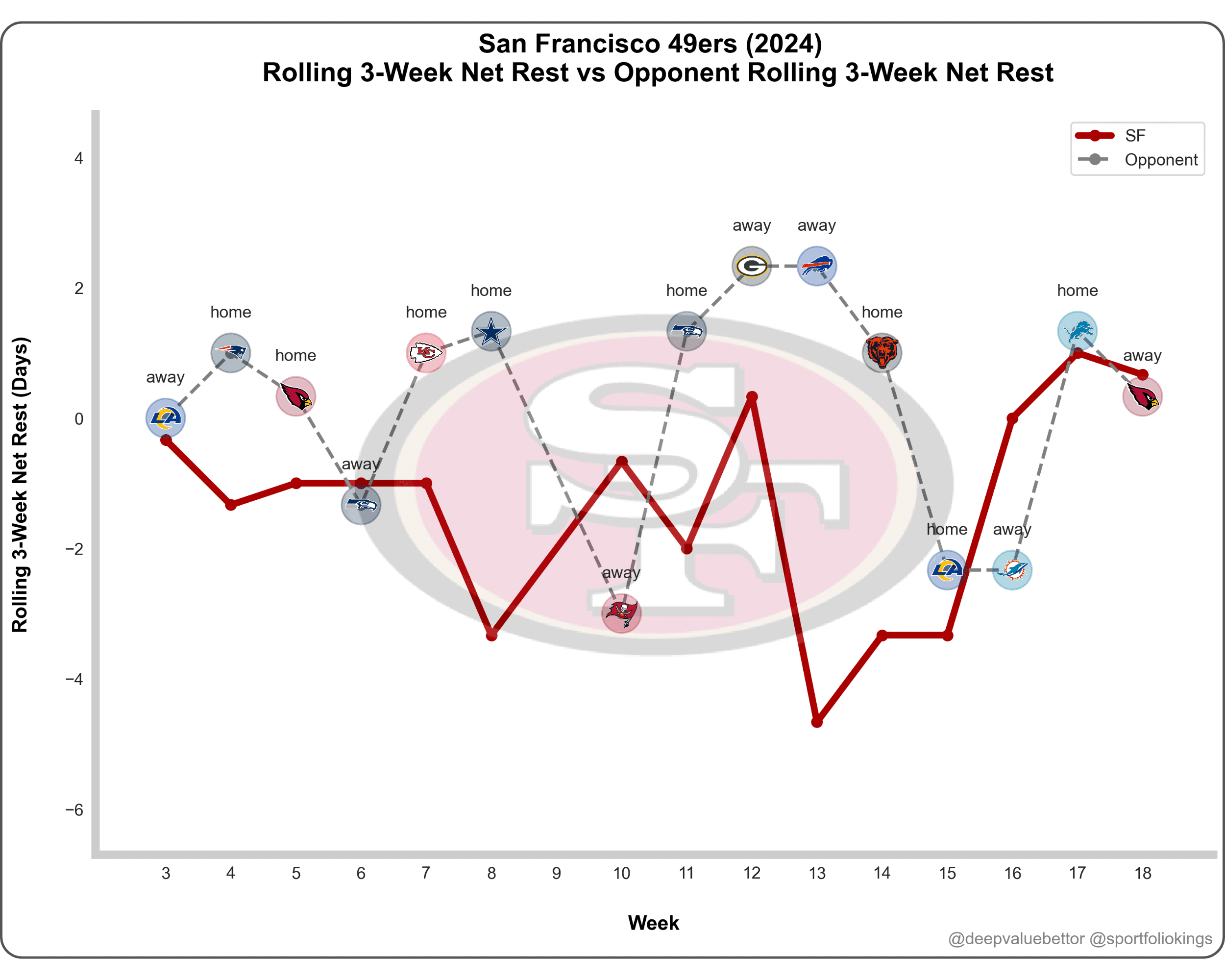 Separately, there’s been accusations that the magnitude of net rest discrepancies are getting worse season-over-season due to poor scheduling by the NFL league office (ostensibly due to incompetence and/or to accommodate TV networks, etc.).