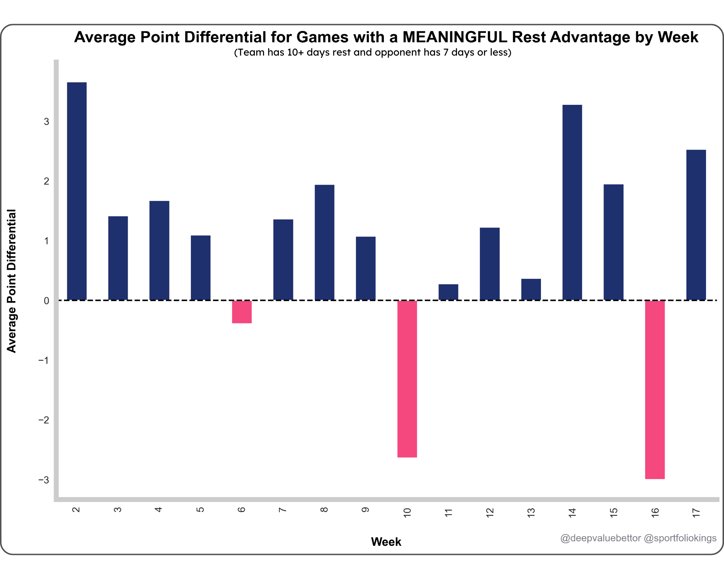 Each spring when the NFL schedule is released, one of the more popular clickbait observations by fantasy and betting analysts is the implied rest discrepancies between teams.