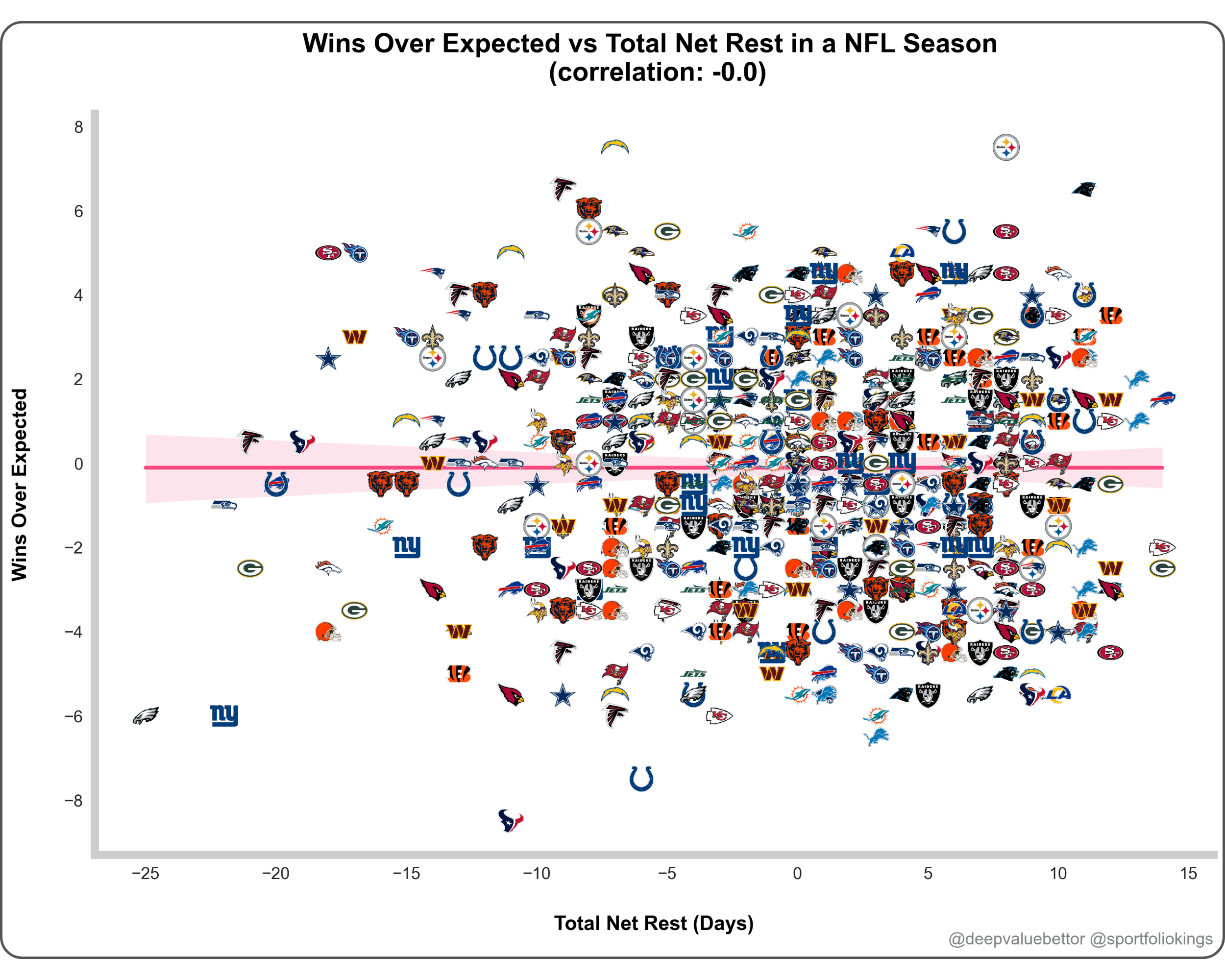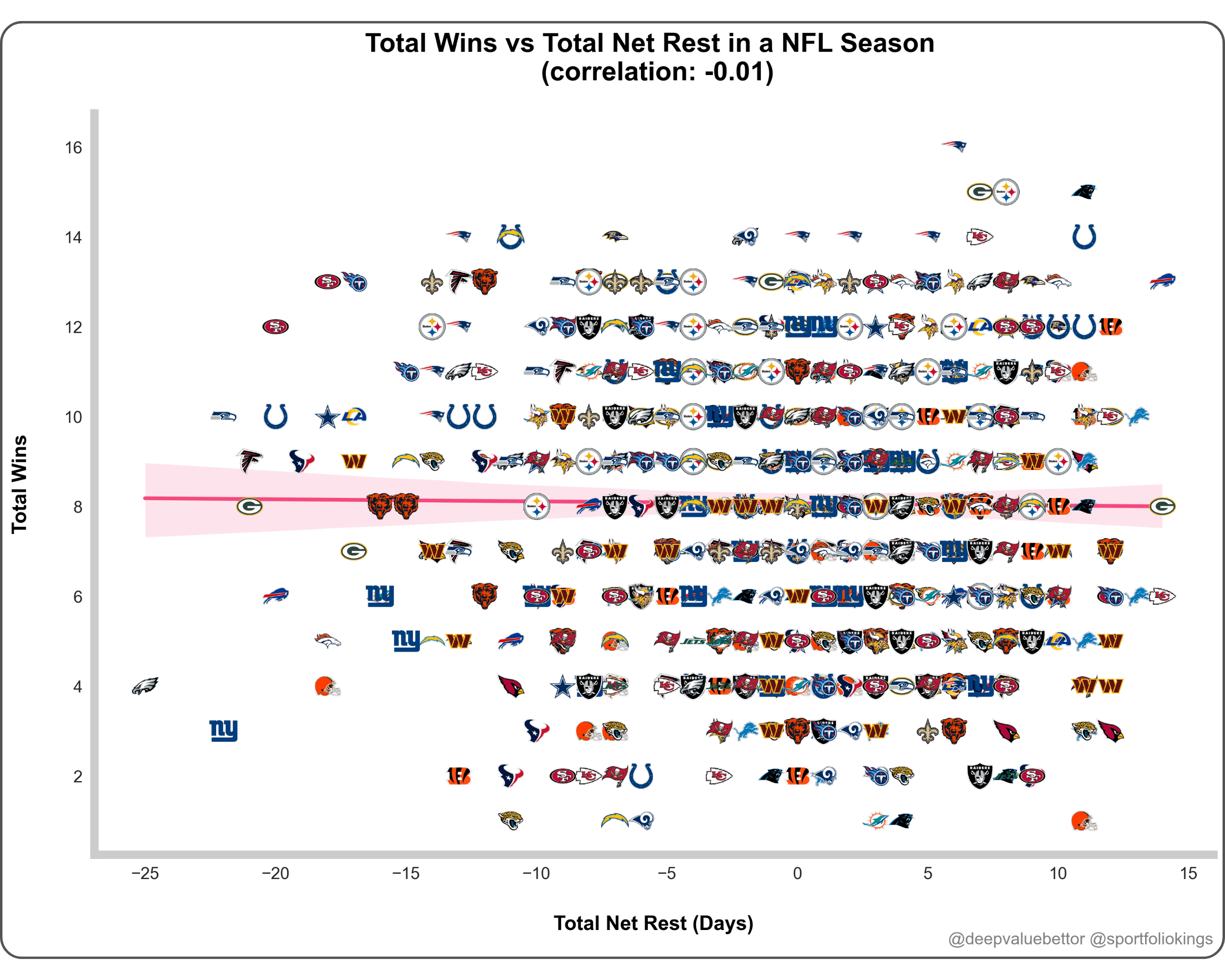 Of course, the observations from these relatively simple analyses are not necessarily dispositive that a team's aggregate net rest has absolutely zero impact on total season wins or performance.