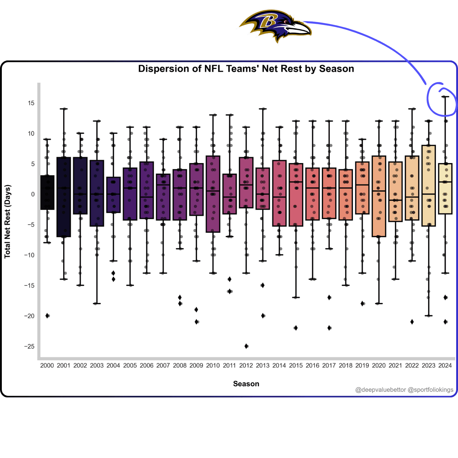 However, while the Ravens’ 16 days of net rest this season is indeed a standout, the dispersion of net rest among teams is broadly consistent with past historical precedent.