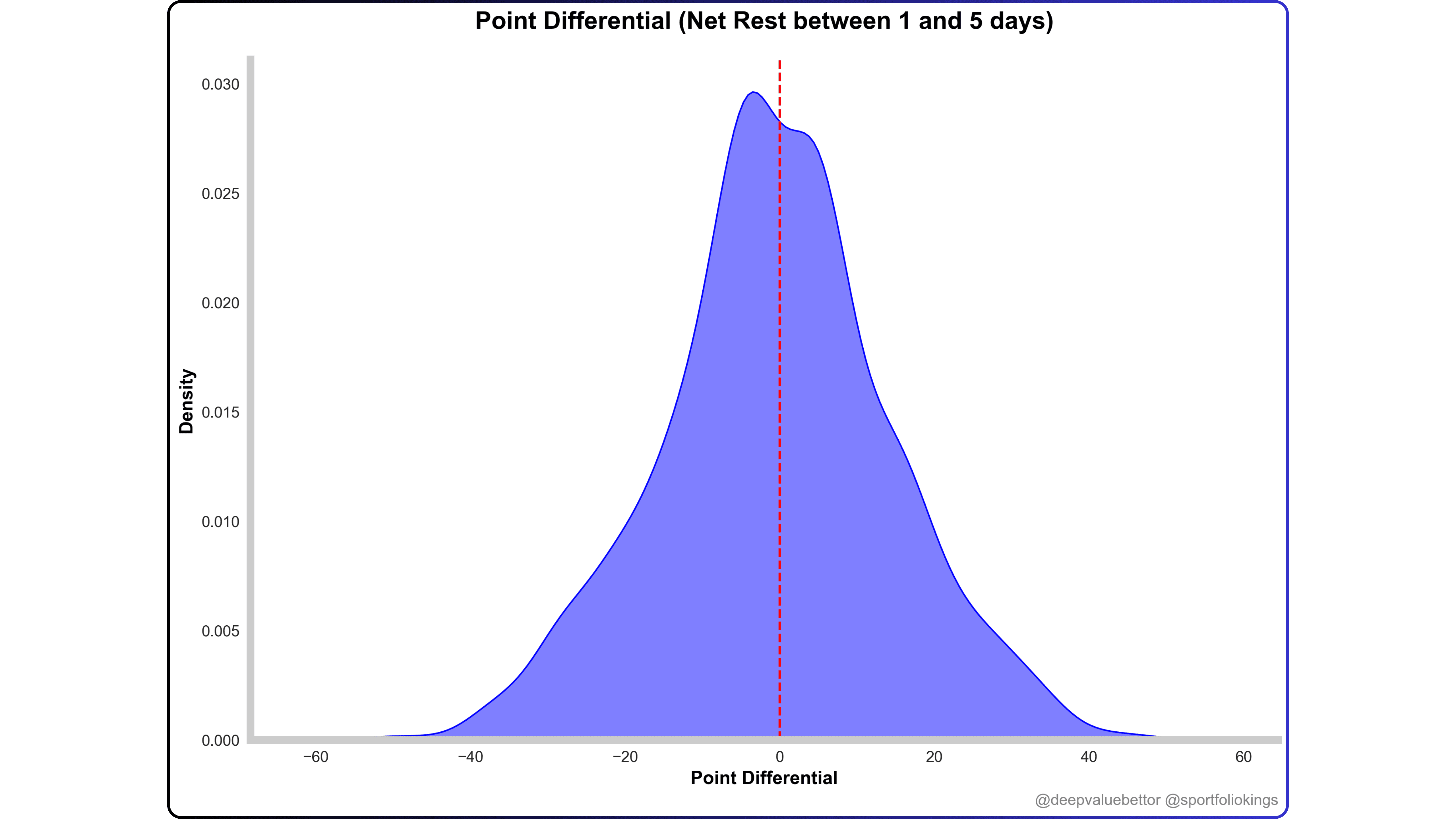 Consistent with the observations above, average and median point differential for a team with a rest advantage of 1-5 days (a sample of approx. 1400 games) are decisively negative. In at least 50% of the sample, the team with positive net rest lose the game by more than 2 points with an average deficit over the entire sample of more than 1/2 a point).